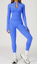 The set includes high-waisted leggings and a fitted zip-up long sleeve top, with the option to style it with either a short or long bra top underneath. Wear it as a full look or mix and match — each piece works beautifully on its own, but together they create a powerful, confident silhouette.